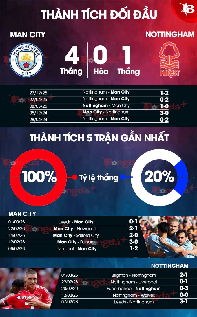 Có nhiều lý do để tin vào một chiến thắng dành cho Man City ở cuộc đối đầu này. Thày trò Pep Guardiola đã thắng 4/5 trận gần nhất tại Ngoại hạng Anh gặp Nottingham (thua 1), trong đó có chiến thắng 2-1 hồi đầu mùa giải tại sân City Ground.