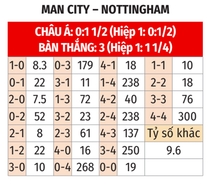 - Lẻ bàn thắng: 3/4 cuộc đối đầu gần nhất, 4/5 trận gần đây của Man City và cả 4 trận vừa qua của Nottingham đều có tổng bàn thắng là lẻ, Ngoài ra, 9/13 chuyến làm khách vừa qua của Nottingham cũng có tổng bàn thắng không chia hết cho 2.