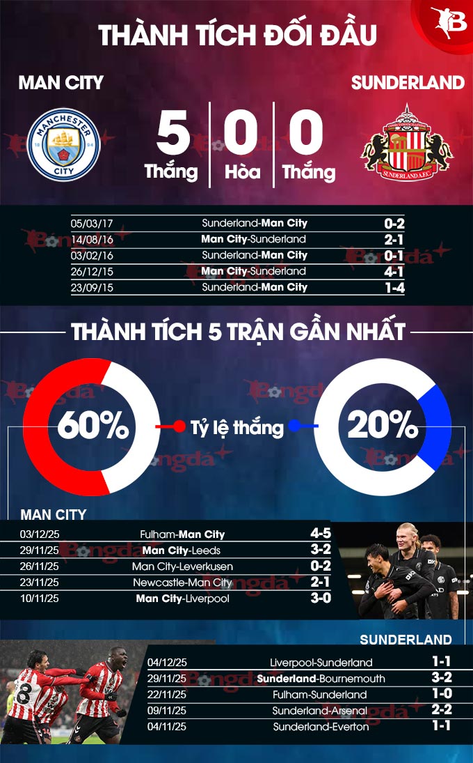 Càng có lý do để đặt niềm tin vào Man City ở trận đấu này nếu nhìn vào thống kê đối đầu giữa 2 đội trong quá khứ. Cụ thể, Man xanh áp đảo trong 9 lần gần đây đụng Sunderland tại giải nội địa, bao gồm 8 chiến thắng. Riêng ở Etihad, đội bóng thành Manchester bất bại 12 trận liên tiếp gần đây trước Mèo đen trong khuôn khổ Premier League bao gồm 10 trận thắng.