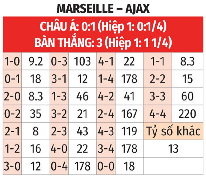- Marseille thắng châu Á hiệp 1: Trên sân nhà đang chứng kiến Marseille nhập cuộc rất chủ động, khi toàn thắng 6 trận chính thức gần đây ngay trong 45 phút đầu tiên. Với Ajax, đội bóng Hà Lan thua theo châu Á 4 trận liên tiếp trên sân khách, trong đó có 2 trận thua cả chuyên môn.