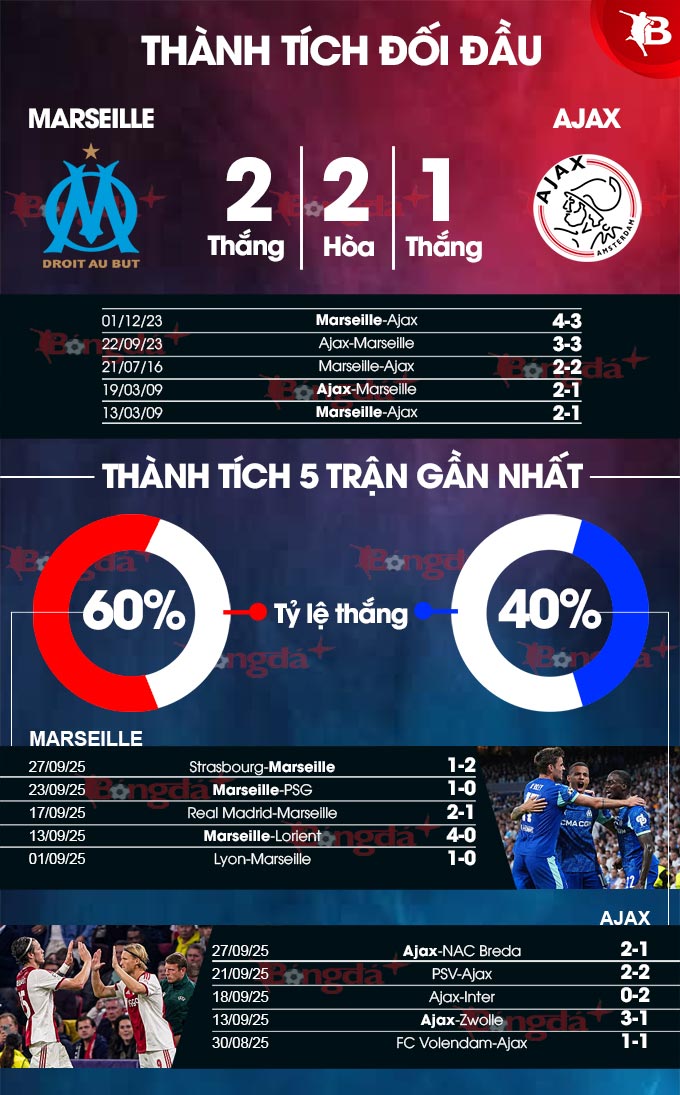 - Bùng nổ bàn thắng: 4/6 trận sân khách gần đây của Ajax đều có ít nhất 4 bàn thắng được ghi. Với Marseille, các chân sút đội bóng Ligue 1 ghi tới 10 bàn sau 3 trận chính thức từ đầu mùa trên sân nhà. Chưa kể, 3 trận đối đầu gần nhất cũng có tối thiểu 4 pha làm bàn.