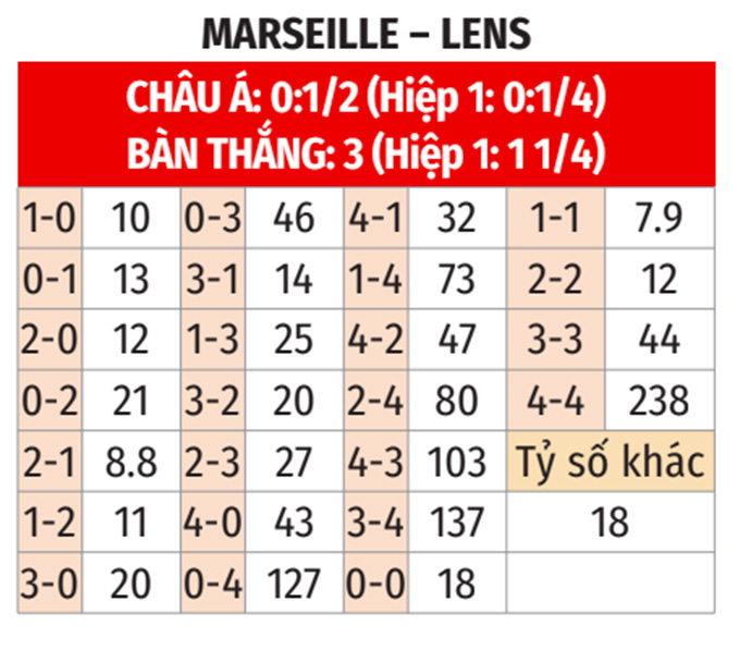 - Hiệp 1 tối đa 1 bàn: 7/8 cuộc chạm trán gần nhất, 5/7 trận gần đây của Marseille và 6/8 trận vừa qua của Lens có không quá 1 bàn trong hiệp 1. Ngoài ra, 10/12 trận đối đầu gần nhất tại Velodrome, 7/8 trận sân nhà vừa qua của OM và 7/9 chuyến làm khách gần đây của Lens đều có kịch bản tương tự trong hiệp 1.