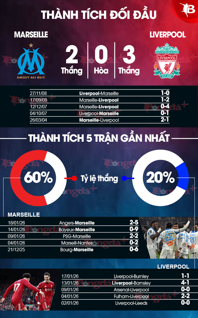Tuy nhiên, mục tiêu đó sẽ khó thực hiện trước hàng công đầy sức mạnh của OM. HLV Roberto De Zerbi đã giúp đội nhà thi đấu rất tưng bừng từ đầu năm 2026 và quyết tâm bẻ nanh vuốt của Quỷ đỏ vùng Merseyside lần này, để qua đó có thể san bằng thành tích đối đầu giữa hai đội (hiện Liverpool thắng 3, OM thắng 2 và hai đội hòa nhau 1 trận sau 6 lần đối đầu).