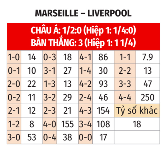 - Lẻ bàn thắng: 4/5 cuộc chạm trán vừa qua, 5/8 trận gần nhất của Marseille và cả 4 trận gần đây của Liverpool tại Champions League đều có tổng bàn thắng là lẻ. Hơn nữa, 4/6 trận sân nhà vừa qua của OM và 10/15 chuyến làm khách gần nhất của Liverpool cũng khép lại với tổng bàn thắng không chia hết cho 2.