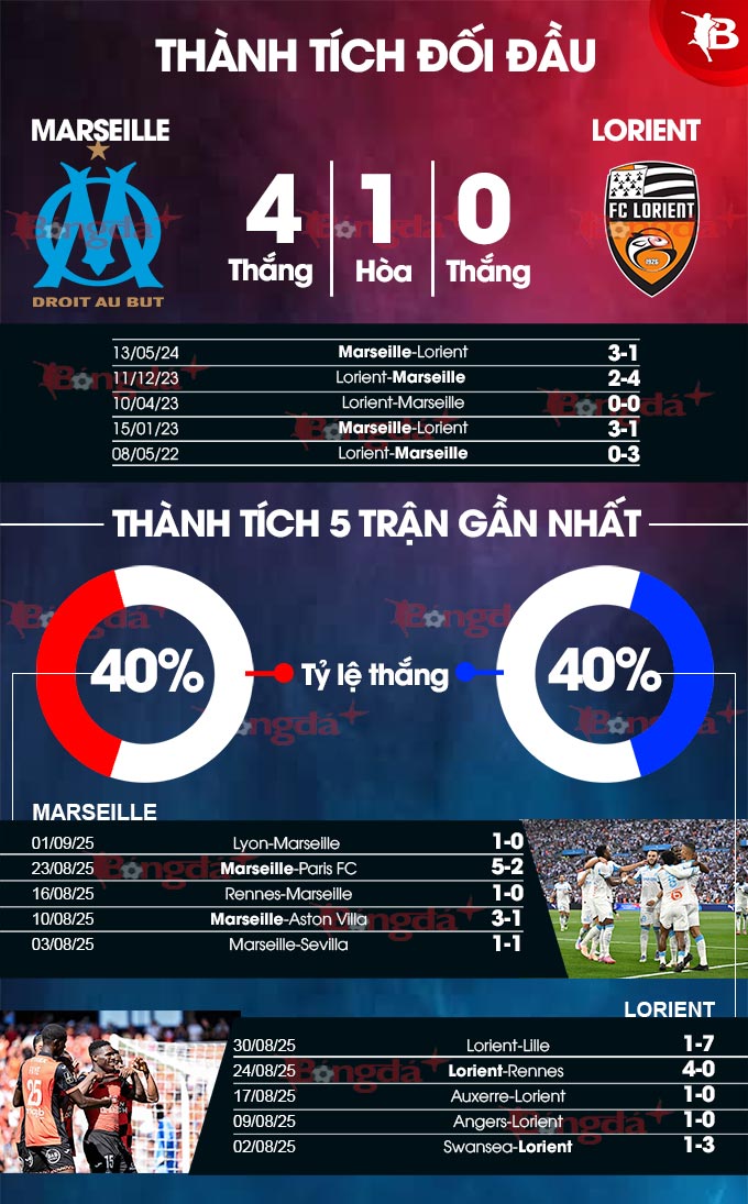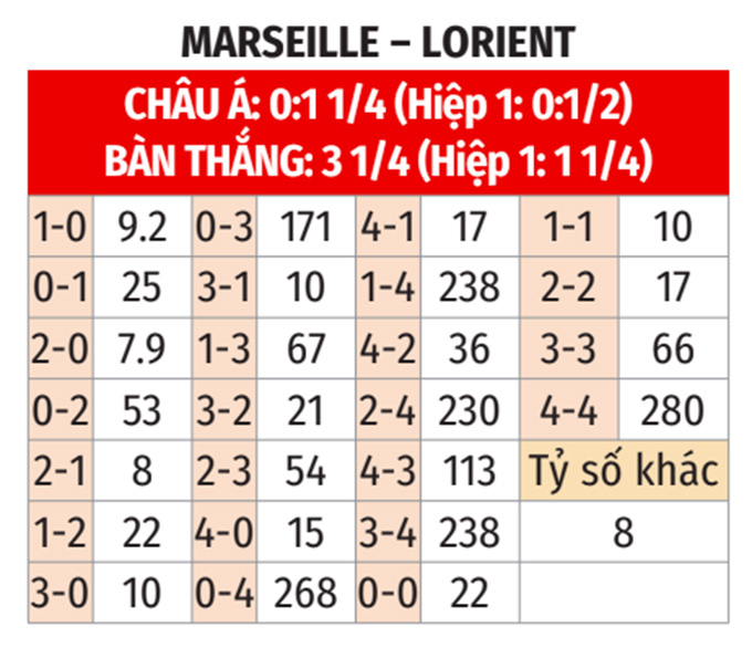 - Marseille ghi bàn hiệp 1: Marseille ghi tối thiểu 1 bàn trong hiệp 1 ở 5/6 cuộc đối đầu gần nhất, ở cả 7 trận sân nhà vừa qua. Ngoài ra, Marseille cũng làm được điều tương tự ở 5/6 lần gần nhất đón tiếp Lorient trên sân nhà. Trận này khó có ngoại lệ.