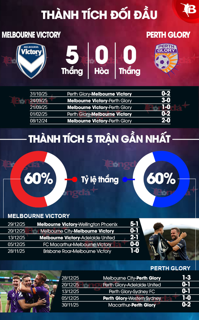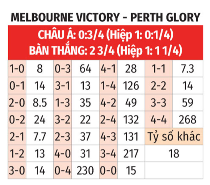 - Tối đa 2 bàn: 4/5 trận gần đây giữa Melbourne Victory và Perth Glory chỉ có tối đa 2 bàn. 6/8 trận vừa qua của Melbourne Victory và 7/8 trận gần nhất của Perth Glory số lần lưới rung cũng không lên được tới 3.
