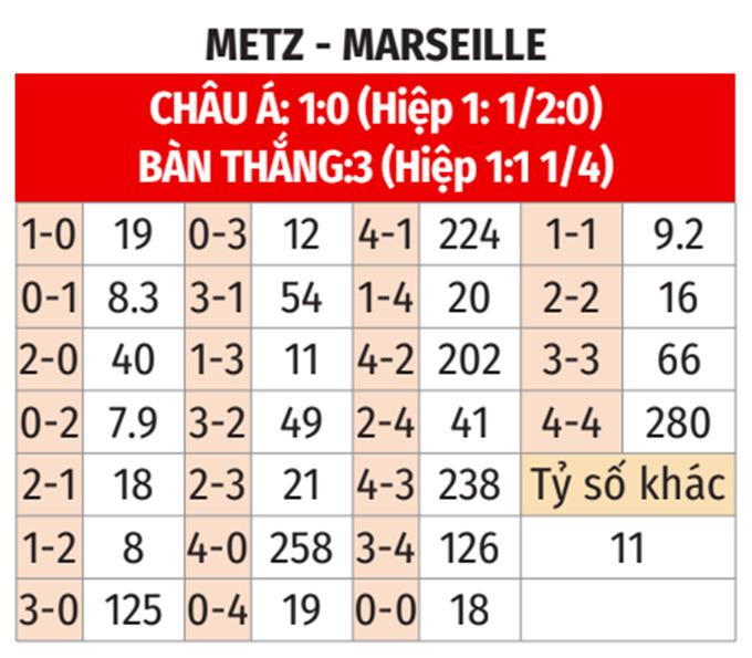 - Không quá 1 bàn thắng trong hiệp 1: Cả 7 cuộc đối đầu giữa hai đội đều khép lại với tối đa 1 lần lưới rung trong hiệp đấu đầu tiên. Kịch bản tương tự cũng xảy ra ở 7/8 trận sân nhà gần đây của Metz và ở 7/8 chuyến làm khách vừa qua của Marseille. Xem ra, nhiều khả năng kịch bản nói trên cũng rất dễ xảy ra trong hiệp 1 của trận này.