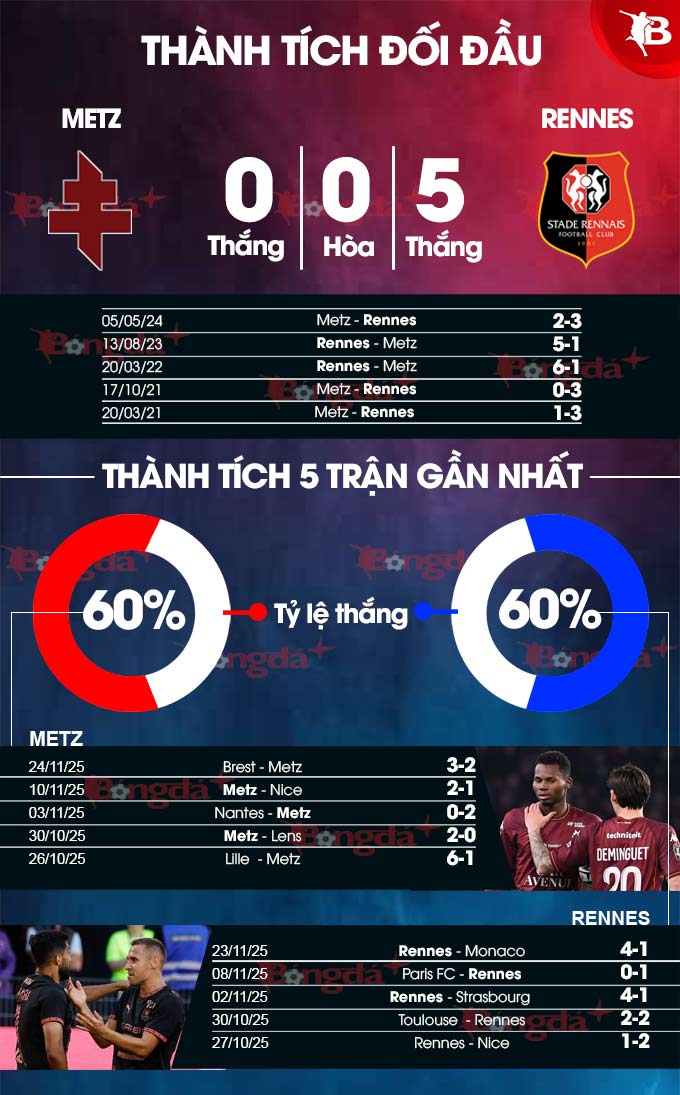 Tính đến thời điểm hiện tại, Metz đã để thủng lưới tới 30 lần, cao nhất Ligue 1, mặc dù chỉ có 5 bàn trong số đó diễn ra trên sân nhà của họ. Đây chính là cơ hội để Rennes tận dụng thành công trong việc kéo dài chuỗi toàn thắng lên con số 4 và chuỗi bất bại lên con số 5.