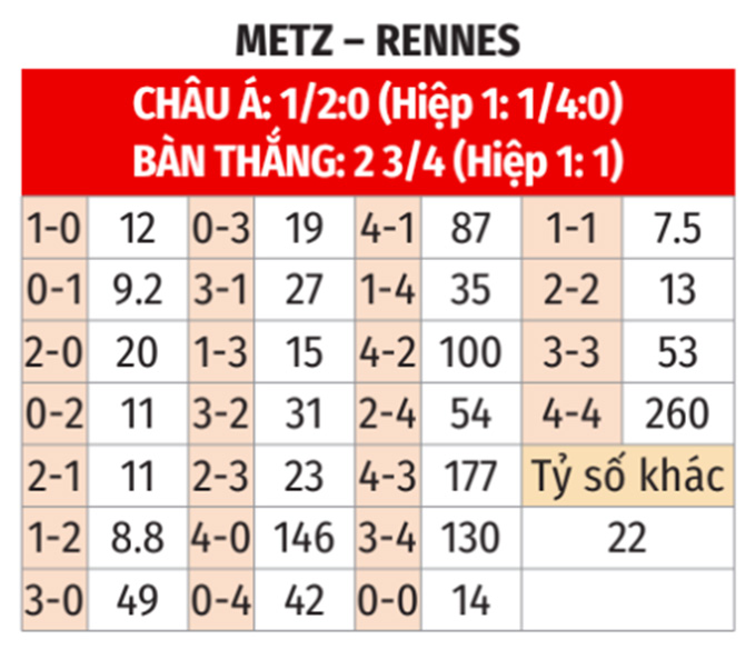 - Từ 3 bàn trở lên: Cả 5 cuộc đụng độ gần nhất, 5/7 trận gần đây của Metz và 6/7 trận vừa qua của Rennes cũng đều có tối thiểu 3 lần lưới rung cả trận. Ngoài ra, 3/4 chuyến xa nhà vừa qua của Rennes cũng chứng kiến tối thiểu 3 bàn thắng cả trận.