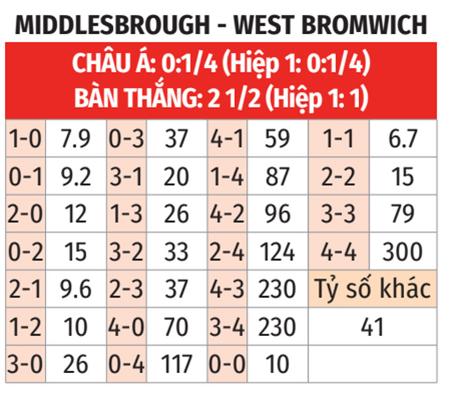 - X cả trận: 8/10 trận gần đây giữa Middlesbrough và West Brom đều về X. 5/6 trận vừa qua của West Brom cũng diễn ra theo kịch bản tương tự.