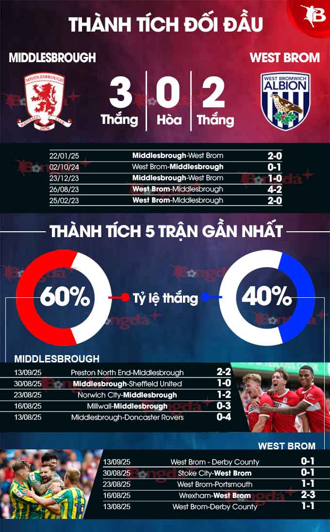 Middlesbrough đang là đội bóng có thành tích tốt nhất ở Championship 2025/26. Chỉ phải gặp West Brom mới để đứt mạch bất bại, Middlesbrough nhiều khả năng sẽ thu về số điểm tối đa để củng cố ngôi đầu BXH.