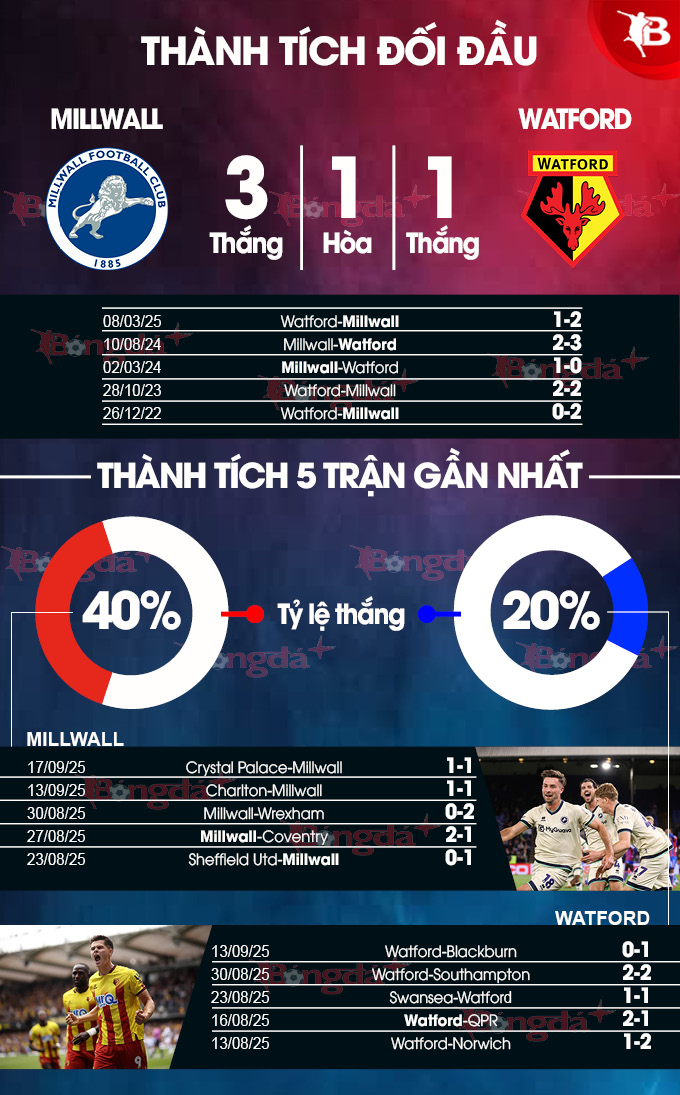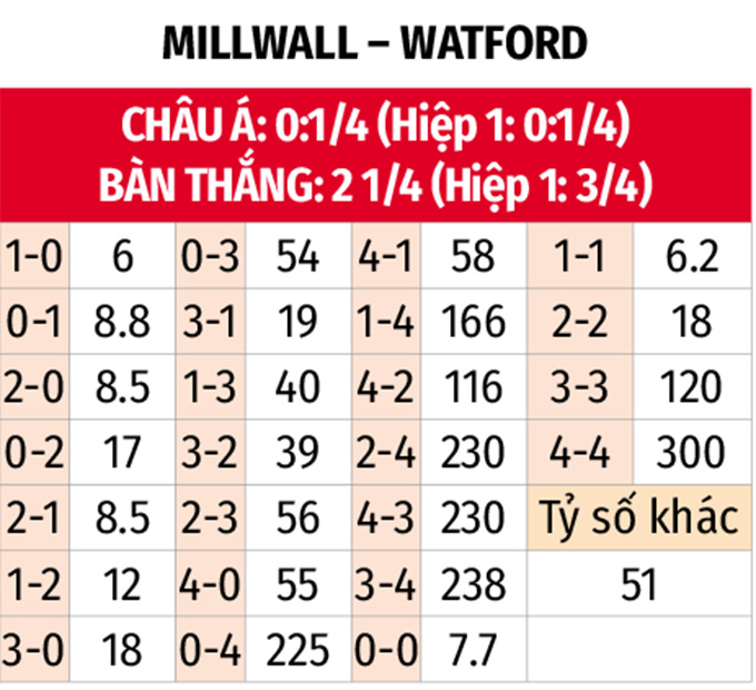 - Không quá 2 bàn thắng: 5/7 trận gần đây của Millwall cùng 7/10 trận vừa qua của Watford đều có không quá 2 bàn thắng được ghi. Lịch sử cũng ghi nhận 4/6 trận đối đầu gần nhất giữa hai đội xuất hiện tối đa 2 pha làm bàn.