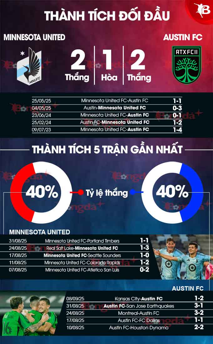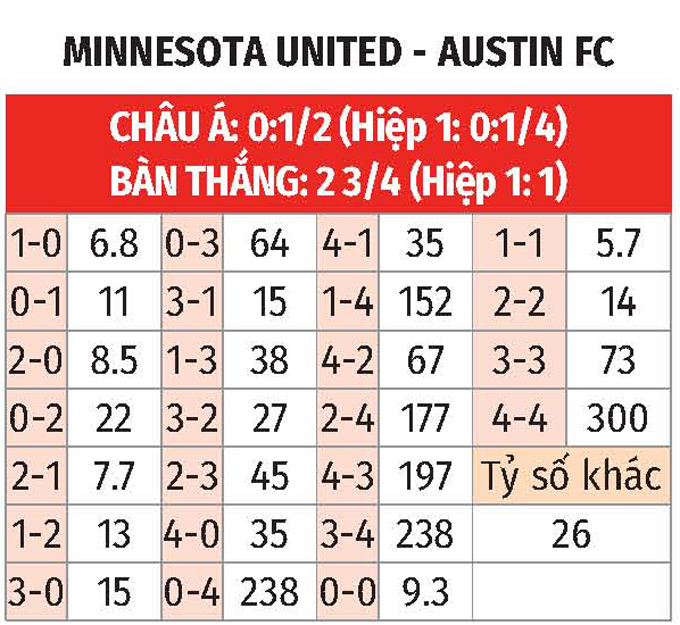 - Chẵn bàn thắng: 4/6 trận gần nhất của Minnesota có tổng bàn thắng chia hết cho 2. Ngoài ra, 6/9 trận vừa qua của Austin FC đều chứng kiến điều tương tự.