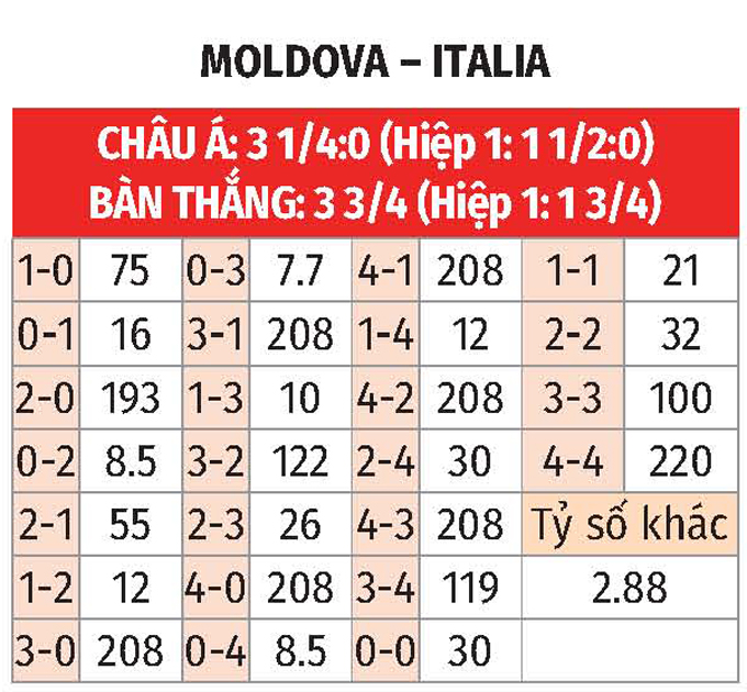 Hơn nữa Italia lại được đánh giá vượt trội Moldova. Do đó, có khả năng, Italia sẽ giành chiến thắng ở trận đấu này.
