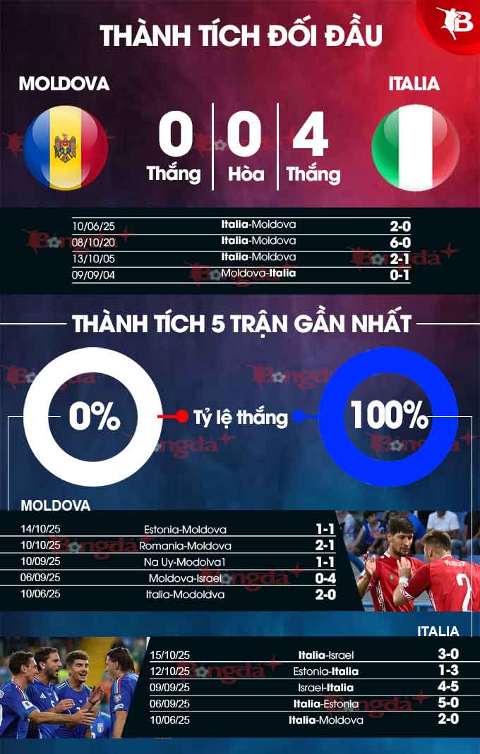 Trong khi Moldova thua 5 trận gần nhất thì Italia toàn thắng ở 5 trận vừa xong. Ngay cả khi Moldova có lợi thế sân nhà, họ cũng đang chơi không tốt khi thua 3 trận gần nhất. Chiều ngược lại, Italia chỉ thua 1/5 trận sân khách vừa xong.
