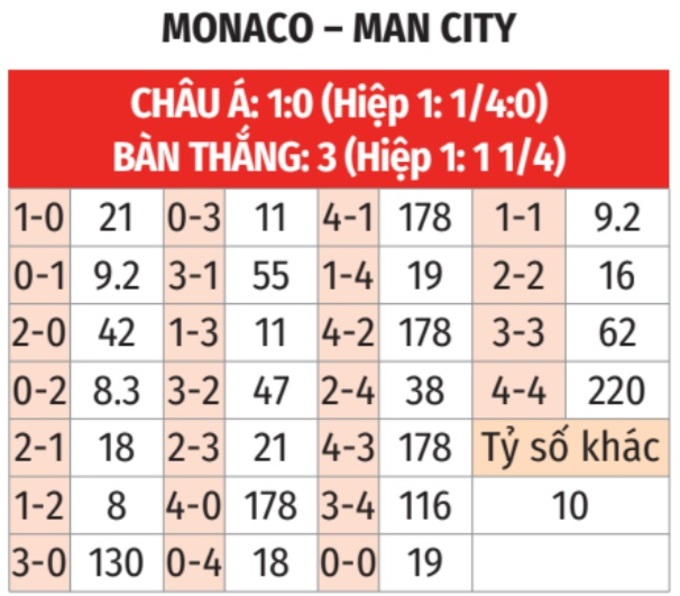 - Nhiều góc hiệp 1: 10/14 trận đấu gần đây của Monaco đều xuất hiện từ 5 quả phạt góc trở lên trong hiệp 1. Tình trạng tương tự xảy ra ở 3/4 trận đấu gần nhất của Man City.