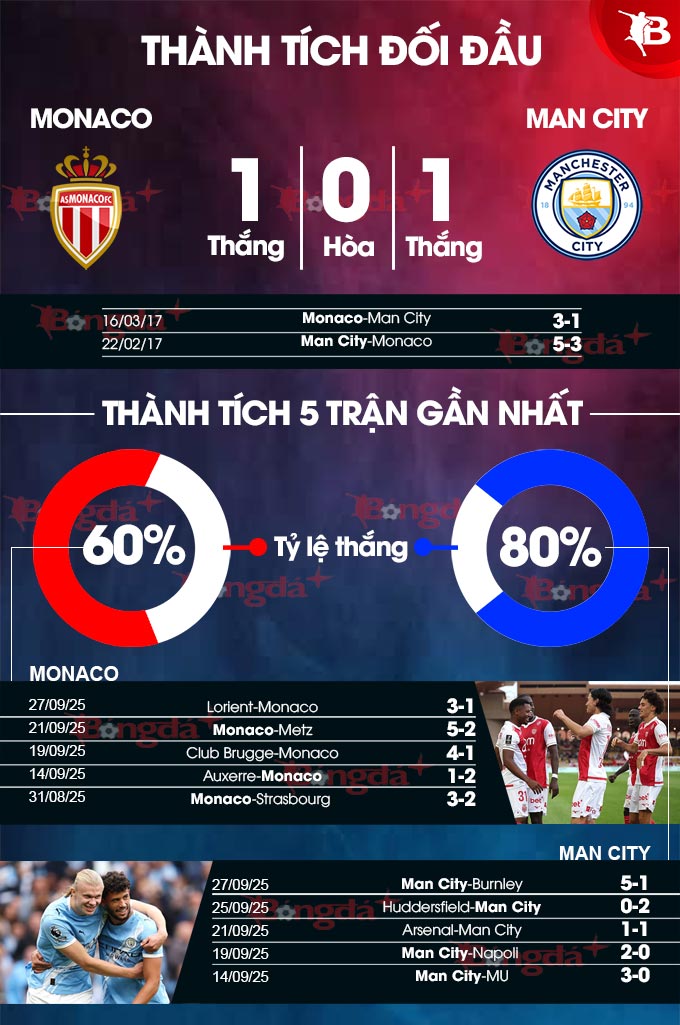 Man City đang có phong độ rất cao. Họ bất bại 5 trận gần đây, trong đó giành 4 chiến thắng. Trước thềm chuyến hành quân đến Monaco, thầy trò HLV Pep Guardiola lấy khí thế bằng màn vùi dập đội khách Burnley với tỉ số 5-1 tại vòng 6 giải Ngoại hạng Anh. Trong đó, chân sút Erling Haaland tỏa sáng với 1 cú đúp và 1 kiến tạo.