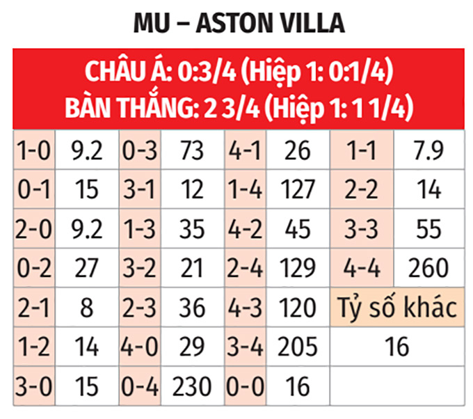 - Tối đa 1 bàn hiệp 1: 3/4 trận gần nhất giữa MU và Aston Villa chỉ có tối đa 1 bàn trong hiệp 1. Điều tương tự cũng diễn ra ở 3/4 trận gần đây của MU và 6/8 trận vừa qua của Aston Villa.