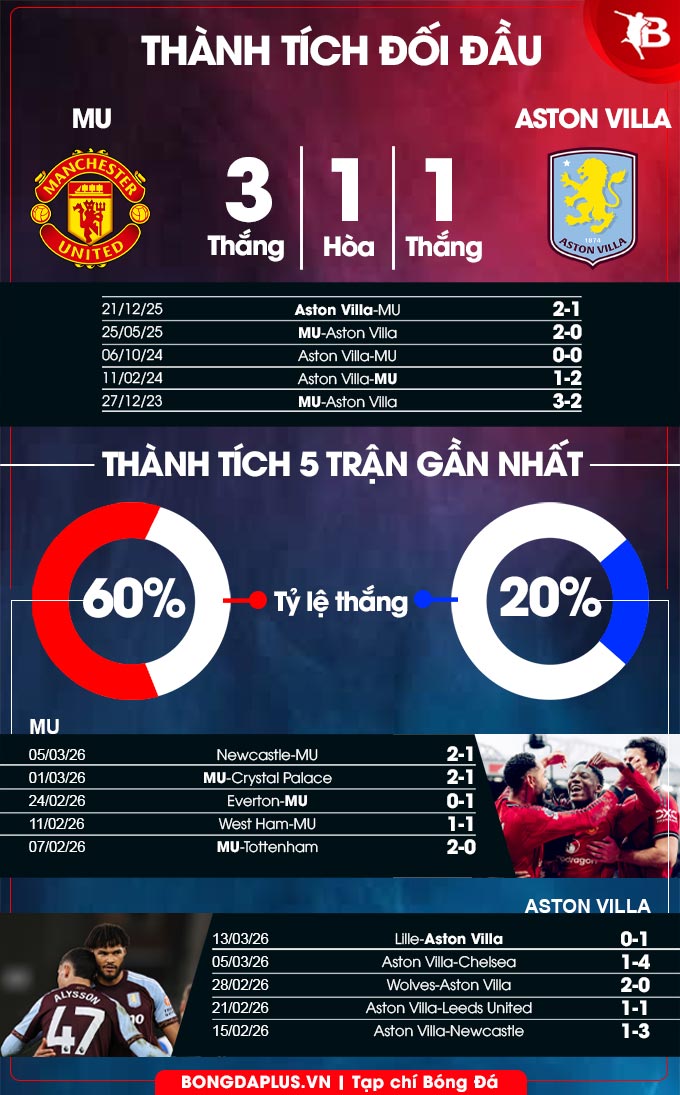 Nên nhớ, trong 6 lần gần nhất làm khách tại Old Trafford, Aston Villa có đến 5 lần phải nhận thất bại khi ra về. Nói tóm lại thì mọi thứ đang đứng về phía MU, thay vì ủng hộ đội khách. Với phong độ sân nhà cực cao cùng lợi thế thể lực khi không phải đá cúp châu Âu vào giữa tuần, MU có nhiều cơ hội giành trọn 3 điểm.