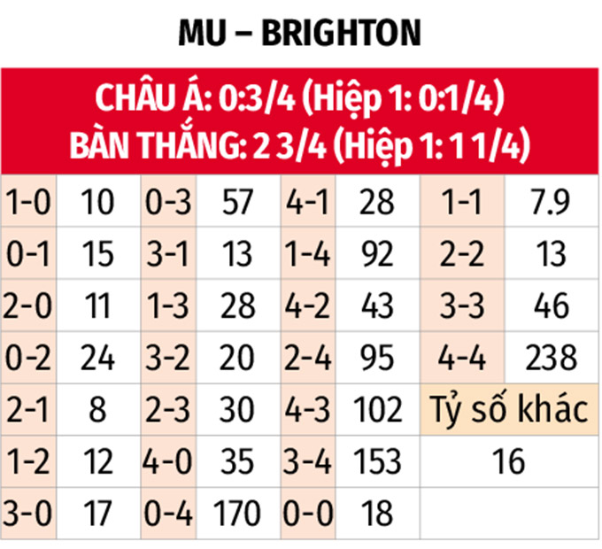 - MU thắng châu Á hiệp 1: Brighton đang nhập cuộc khá tệ ở những chuyến làm khách, khi để thua châu Á 4 trận liên tiếp gần đây. Với MU, Quỷ đỏ thắng châu Á 2/3 trận sân nhà vừa qua trước giờ nghỉ, thắng châu Á trận đối đầu gần nhất trong 45 phút đầu tiên.