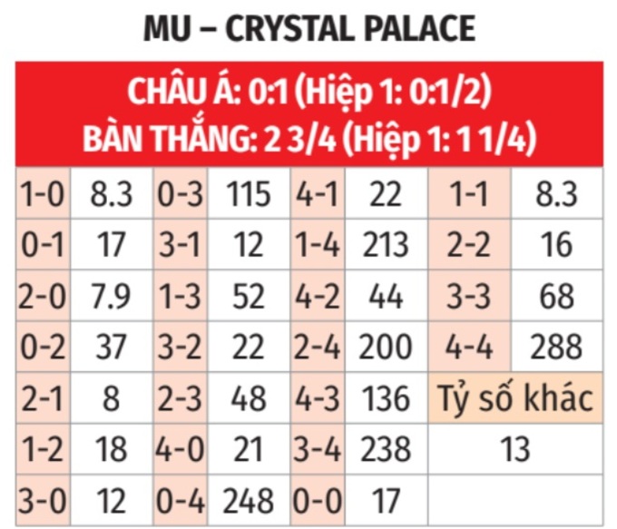 • Tối đa 4 góc hiệp 1: Cả 3 trận đấu gần đây của MU đều chỉ có tối đa 4 quả phạt góc trong hiệp 1. Tình trạng tương tự xảy ra ở 4/5 trận đấu vừa qua của Crystal Palace.