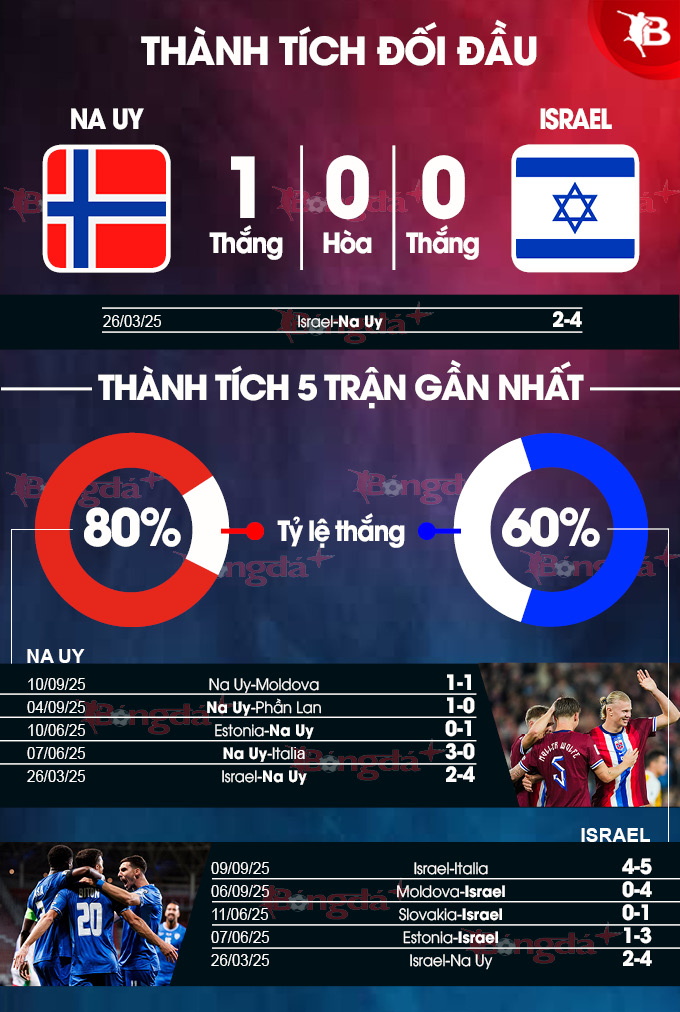 Trong khi Na Uy toàn thắng 5 trận gần nhất thì Israel thắng 3/5 trận vừa xong. Na Uy có lợi thế sân nhà và toàn thắng tại đây. Chiều ngược lại, Israel chỉ thắng 2/5 trận sân khách gần nhất.