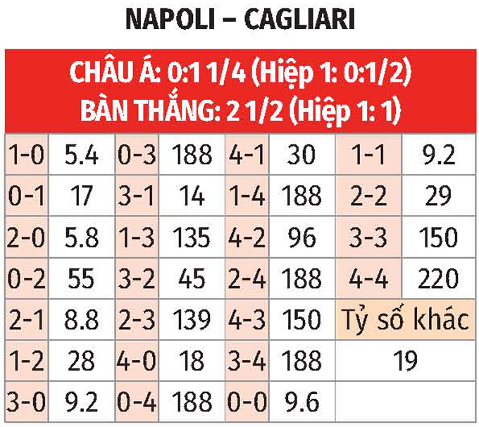 - Hai đội cùng ghi bàn: Napoli đã thành công trong việc ghi bàn ở 3/4 trận gần nhất còn với Cagliari là ở 3/5 trận mới đây. Bên cạnh đó, Napoli cũng ghi bàn ở 3/5 trận gần nhất trên sân nhà, còn với Cagliari là 3/5 trận vừa qua tại sân khách. Với xu hướng như vậy, khả năng cao hai đội sẽ cùng tìm được đường vào khung thành của nhau.