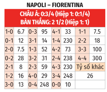 - Fiorentina thắng theo châu Á: Fiorentina thắng theo châu Á 4/5 trận Serie A gần đây. Napoli thua theo châu Á cả 5 trận chính thức vừa qua, họ cũng chỉ thắng (không xét tỷ lệ) đúng 1/7 trận chính thức gần nhất. 9 lần gần nhất tiếp Fiorentina trên sân nhà, thành tích theo châu Á của Napoli là thắng 2, hòa 1 và thua 6. Napoli hơn đối phương tới 14 bậc trên BXH nên trên sân nhà nhường 3/4 bàn là thấp, nên cổ vũ đội khách.