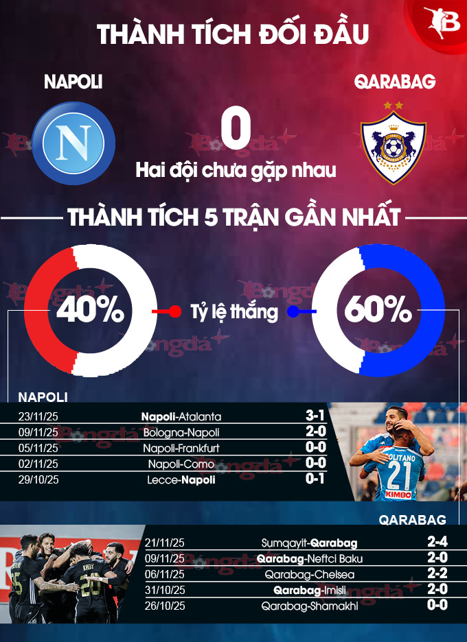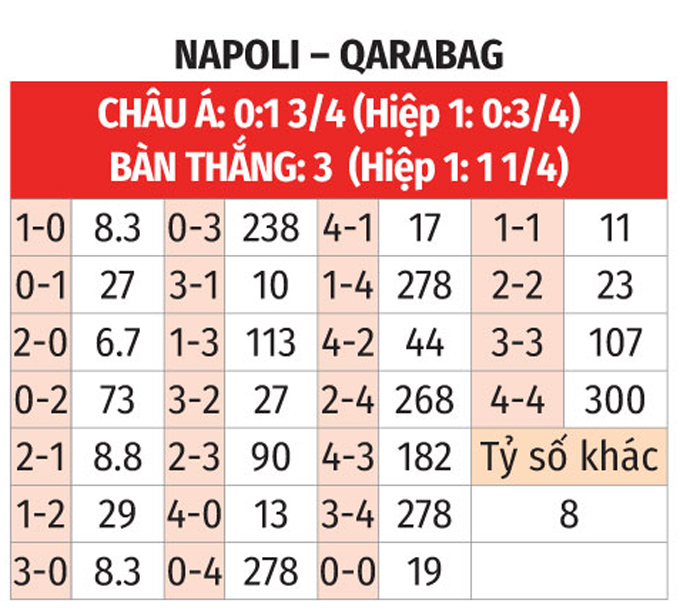 - Chẵn bàn thắng: 6/7 trận gần nhất của Napoli có tổng bàn thắng chia hết cho 2. Ngoài ra, 5 trận vừa qua của Qarabag chứng kiến điều tương tự.