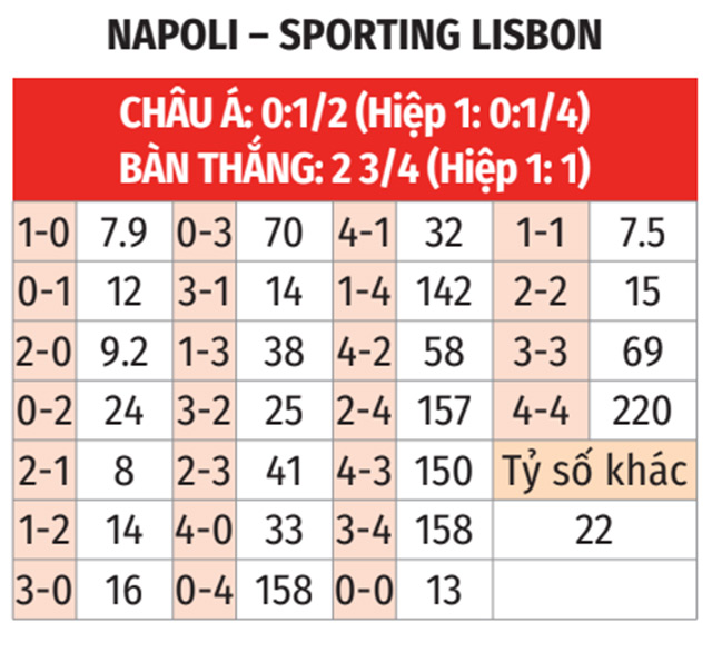 - Tỷ số lẻ: 3/4 trận sân nhà gần nhất của Napoli kết thúc với tỷ số lẻ. 6 trận gần nhất của Sporting Lisbon cũng có số bàn thắng không chia hết cho 2.