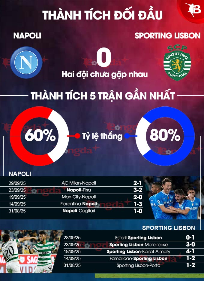 - Hai đội cùng ghi bàn: 3/4 trận vừa qua của Napoli đều không có đội "tịt ngòi". 5/7 trận sân khách gần nhất của Sporting Lisbon cũng không bên nào thành công trong việc giữ sạch lưới.