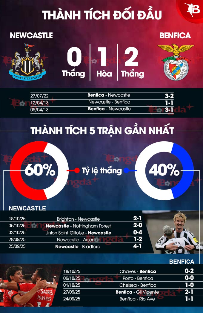 Trong quá khứ, Benfica chưa từng ngán Newcastle. Trong 3 lần đụng độ giữa 2 bên, đội bóng của Bồ Đào Nha hoàn toàn áp đảo khi hòa 1 và giành 2 chiến thắng. Điều này sẽ giúp các cầu thủ Benfica có thêm sự tự tin khi hành quân đến sân St. James’ Park để bước vào trận đấu tại vòng phân hạng UEFA Champions League 2025/26.