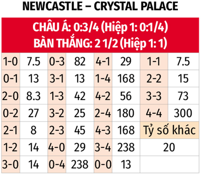 - Ít nhất 1 bàn hiệp 1: 4 trận liên tiếp gần đây của Newcastle có bàn thắng trong hiệp 1, với 3 trận trong số đó có tối thiểu 2 pha làm bàn. 4/5 trận sân khách vừa qua của Crystal Palace cùng 2 trận đối đầu gần nhất trên sân nhà của Newcastle cũng xuất hiện bàn thắng trước giờ nghỉ.