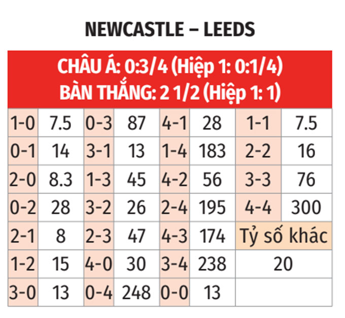- Tỷ số chẵn: 4/5 trận đối đầu gần nhất giữa Newcastle và Leeds kết thúc với tỷ số chẵn. 3/4 trận gầy đây của Newcastle và 6/7 trận vừa qua của Leeds cũng diễn ra theo kịch bản tương tự.