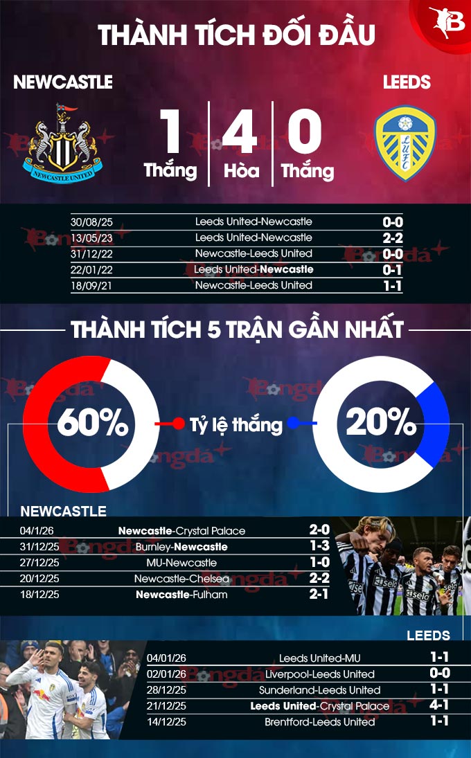 Nói vậy để thấy Leeds xứng đáng là thử thách đáng gờm dành cho Newcastle. Tuy có lợi thế sân nhà, cũng chẳng dễ để Chích chòe có thể hạ được Leeds đang có phong độ cao. Với việc đang có chuỗi 4 trận bất bại liên tiếp khi viếng thăm sào huyệt của Newcastle (thắng 1, hòa 3), khả năng cao là Leeds sẽ có điểm ở trận đấu tới.