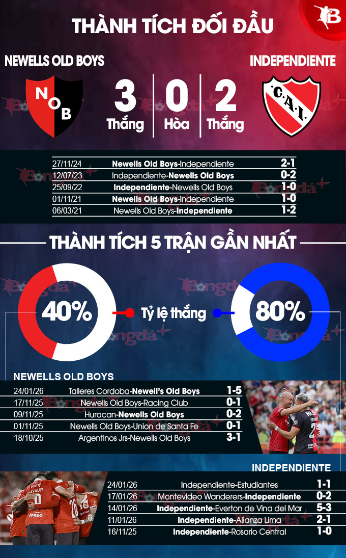 Xét về thành tích đối đầu, Independiente có phần lấn lướt với 6 chiến thắng, 1 trận hòa và 4 thất bại ở 11 trận đối đầu gần nhất. Thậm chí trên sân của Marcelo Bielsa của Newell’s Old Boys, thành tích của Independiente còn áp đảo với 4 chiến thắng, 2 trận hòa và chỉ 2 trận thua ở 8 trận vừa qua.
