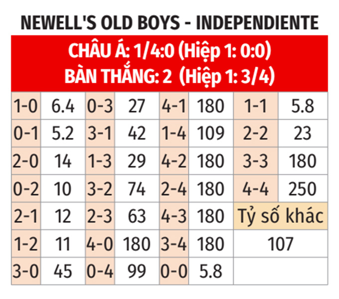 - Lẻ bàn thắng: 5/6 cuộc đối đầu gần nhất, 3/4 trận vừa qua của Newell’s Old Boys và 6/9 trận gần đây của Independiente đều có tổng bàn thắng là lẻ. Không những thế, 5/8 chuyến làm khách vừa qua của Independiente cũng có tổng bàn thắng không chia hết cho 2.