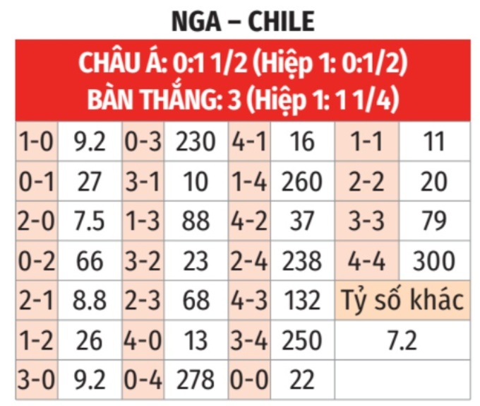 - Tối đa 1 bàn hiệp 1: 4/5 trận sân nhà gần đây của Nga chỉ xuất hiện tối đa 1 bàn thắng trong hiệp 1. 7 trận gần nhất của Chile xảy ra tình trạng tương tự.