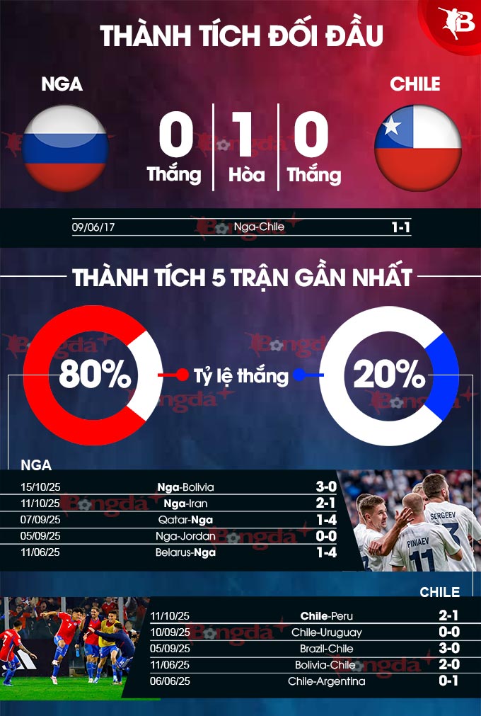 - Tối đa 3 bàn cả trận: 4/5 trận đấu gần đây của Nga chỉ xuất hiện nhiều nhất 3 bàn thắng. Tình trạng tương tự xảy ra ở 7 trận đấu vừa qua của Chile.