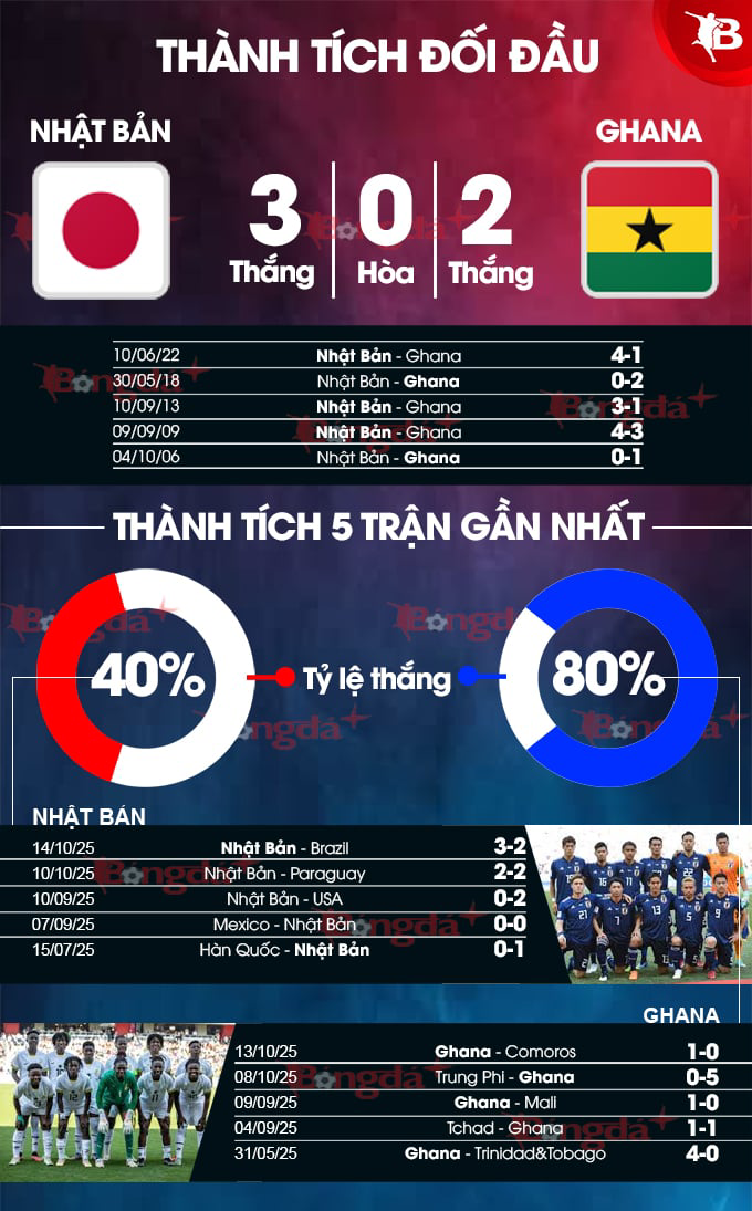 Thành tích đối đầu giữa cả hai đội không có quá nhiều sự chênh lệch khi Nhật Bản có 3 chiến thắng và Ghana thắng 2 lần trong 5 cuộc đối đầu gần nhất giữa cả hai đội. Dự kiến trận đấu vào ngày 14/11 tới tại SVĐ Saitama sẽ là cuộc đôi công hấp dẫn giữa Nhật Bản và Ghana, khi cả hai đội đều đang sở hữu những tiền đạo hàng đầu châu Âu như Minamino, Kudus…