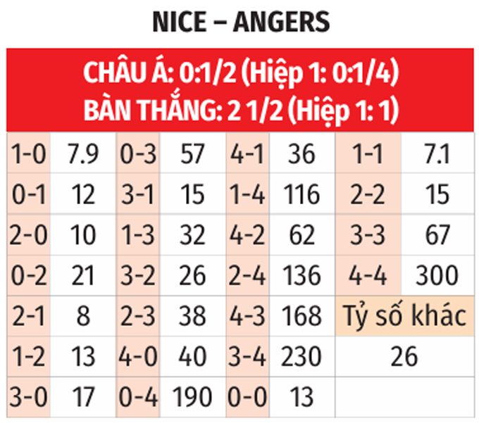 - Lẻ bàn thắng: 8/11 trận đối đầu trước đó giữa Nice vs Angers có tổng bàn thắng không chia hết cho 2. Ngoài ra, 9/15 trận vừa qua của Nice và 10/13 trận gần đây của Angers đều chứng kiến điều tương tự.
