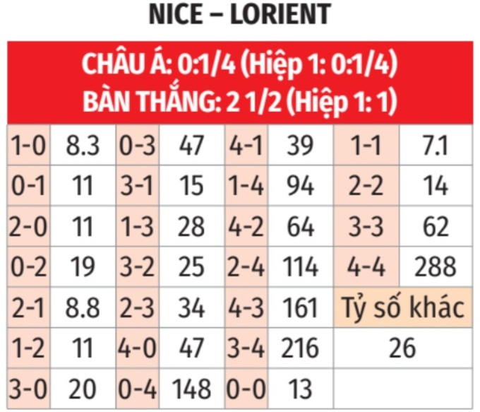 - Chẵn bàn thắng: 3/4 lần đối đầu giữa 2 đội gần đây kết thúc với tổng số bàn thắng là số chẵn. Tình trạng tương tự xảy ra ở 3/4 trận gần đây của Nice và 7/8 trận vừa qua của Lorient.