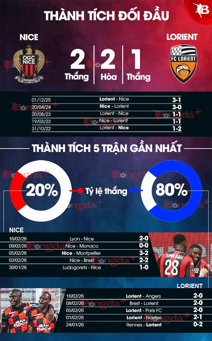 Càng có cơ sở để tin rằng, Lorient sẽ ra về với ít nhất 1 điểm ở trận này nếu nhìn vào đối đầu gần đây giữa 2 đội. Lorient chỉ thua 1/4 cuộc đụng độ gần nhất với Nice. Trong đó ở lượt đi Ligue 1 mùa này, họ đè bẹp Nice với tỉ số đậm 3-1.