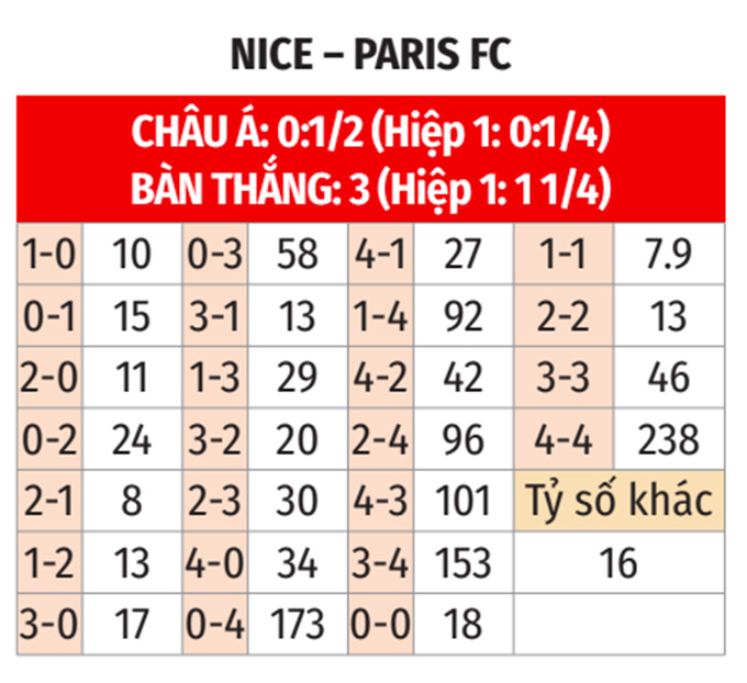 - Paris FC ghi bàn hiệp 1: Paris FC luôn ghi ít nhất 1 bàn thắng trong hiệp 1 ở 8/10 trận gần nhất. Họ cũng làm được điều tương tự ở 6/8 chuyến xa nhà gần đây. Nhiều khả năng đội bóng tân binh này cũng sẽ xuyên thủng lưới Nice ít nhất 1 lần trong hiệp 1.
