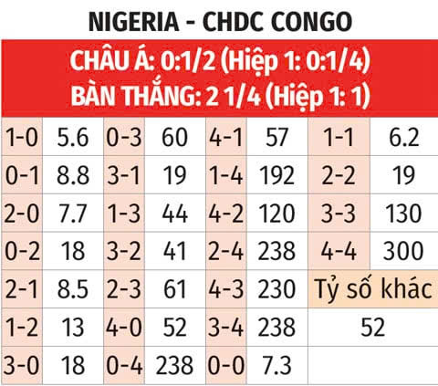 - Tối đa 2 bàn thắng: 4/6 trận gần đây của Nigeria đều có tối đa 2 bàn thắng được ghi, trong khi 3 trận vừa qua của CHDC Congo kết thúc với chiến thắng tối thiểu dành cho họ. Với tính chất quan trọng của trận đấu, màn so T này khả năng sẽ khó xuất hiện nhiều bàn thắng.