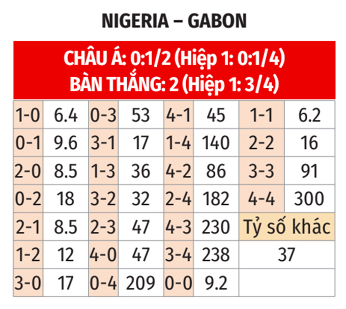 - Chẵn bàn thắng: Cả 3 cuộc đối đầu gần nhất, 8/11 trận gần đây của Nigeria và 4/5 trận vừa qua của Gabon đều có tổng bàn thắng là chẵn. Ngoài ra, 3/4 trận sân nhà gần nhất của Nigeria cũng khép lại với tổng bàn thắng chia hết cho 2.