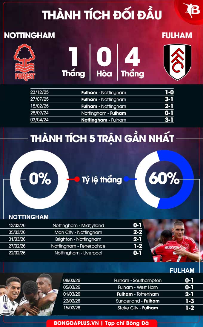 - Tối thiểu 3 bàn cả trận: 5/8 cuộc đối đầu gần nhất, 3/4 trận gần đây của Nottingham và 7/9 trận vừa qua của Fulham đều có ít nhất 3 bàn cả trận. Không những thế, cả 4 chuyến làm khách gần nhất của Fulham cũng chứng kiến tối thiểu 3 lần lưới rung cả trận.
