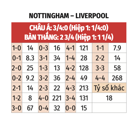 Cả 2 đội ghi bàn: 4/5 trận gần nhất của Liverpool ở Premier League có hiện tượng cả 2 đội ghi được bàn thắng. 5/8 trận gần nhất của Nottingham ở giải nội địa Anh cũng có kịch bản tương tự xảy ra. Trận này nhiều khả năng sẽ có 2 đội cùng ghi được bàn.