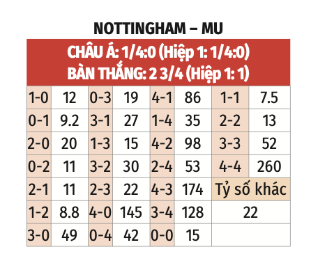 - Tối thiểu 1 bàn hiệp 1: 10/13 trận gần nhất của Nottingham có tối thiểu 1 lần lưới rung hiệp 1. 15/20 trận gần nhất của MU có kịch bản tương tự. NHM nên đợi sau 15 phút đầu rồi tin tưởng tỷ lệ nhiều bàn hiệp 1.