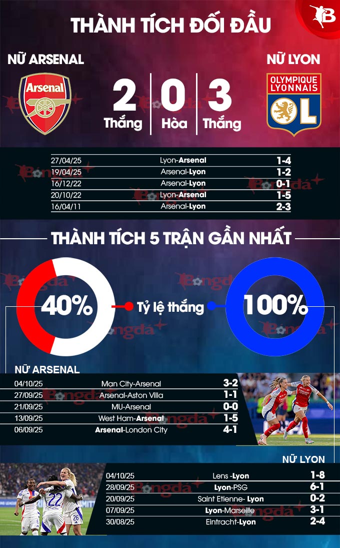 Không những thế, Nữ Lyon bất bại ở 20 chuyến làm khách gần đây, trong đó có 19 chiến thắng và 1 trận hòa. Phong độ hủy diệt của họ hoàn toàn trái ngược với các cô gái Arsenal.